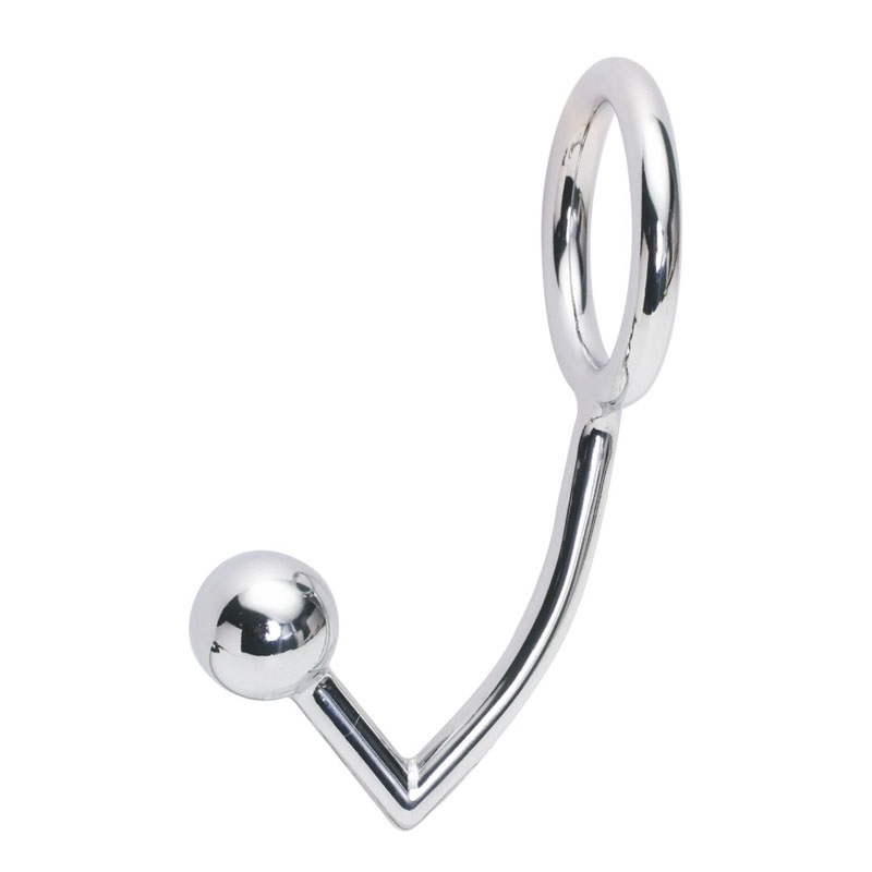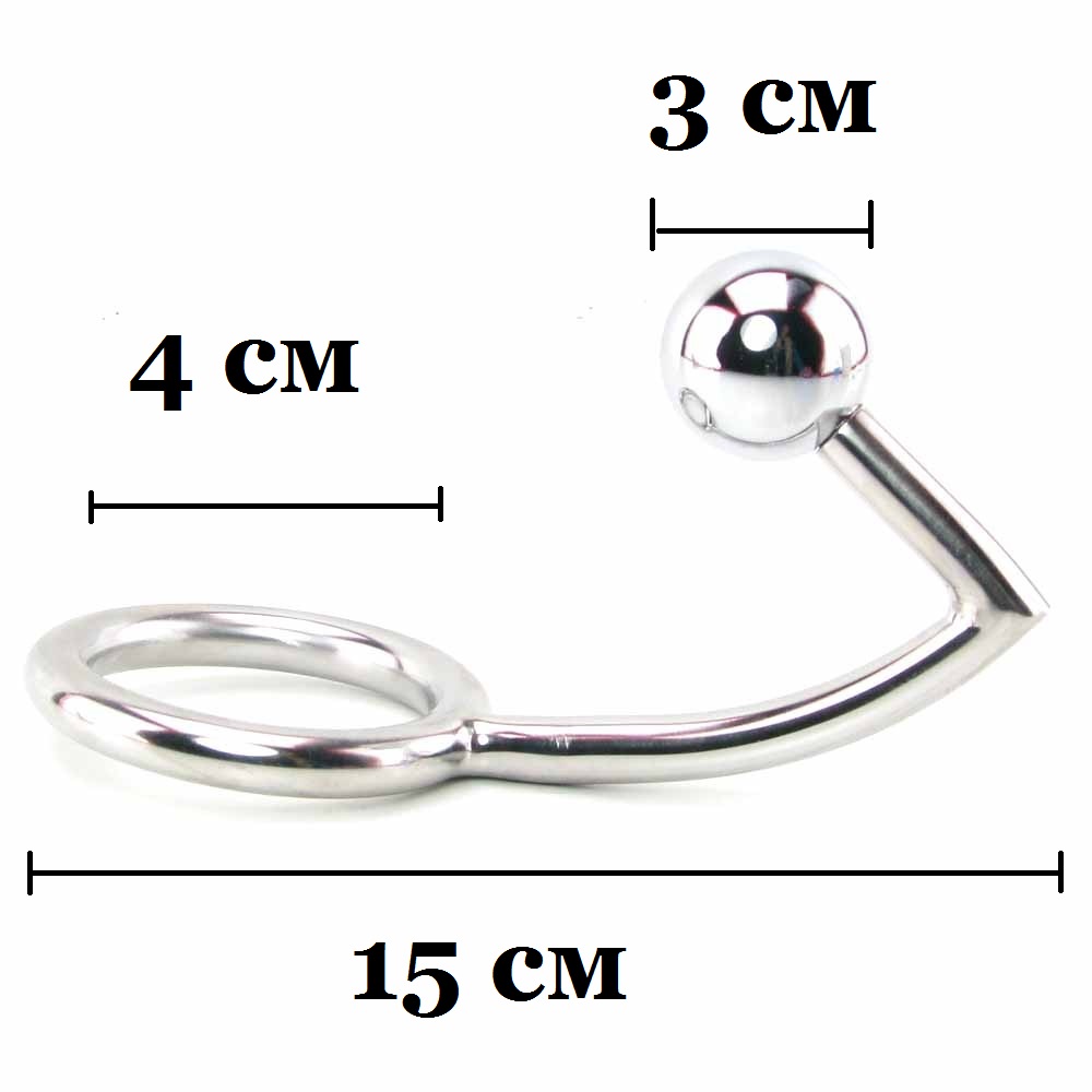 Этот девайс комбинирует в себе металлическое эрекционное кольцо, в которое следует продеть пенис и яички, и анальный крюк с шаром.