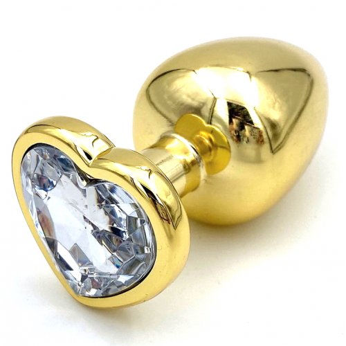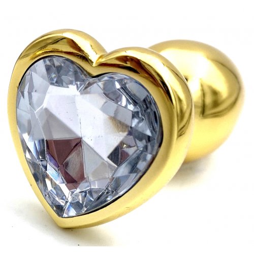 Золотистая анальная пробка с прозрачным камушком в виде сердечка L