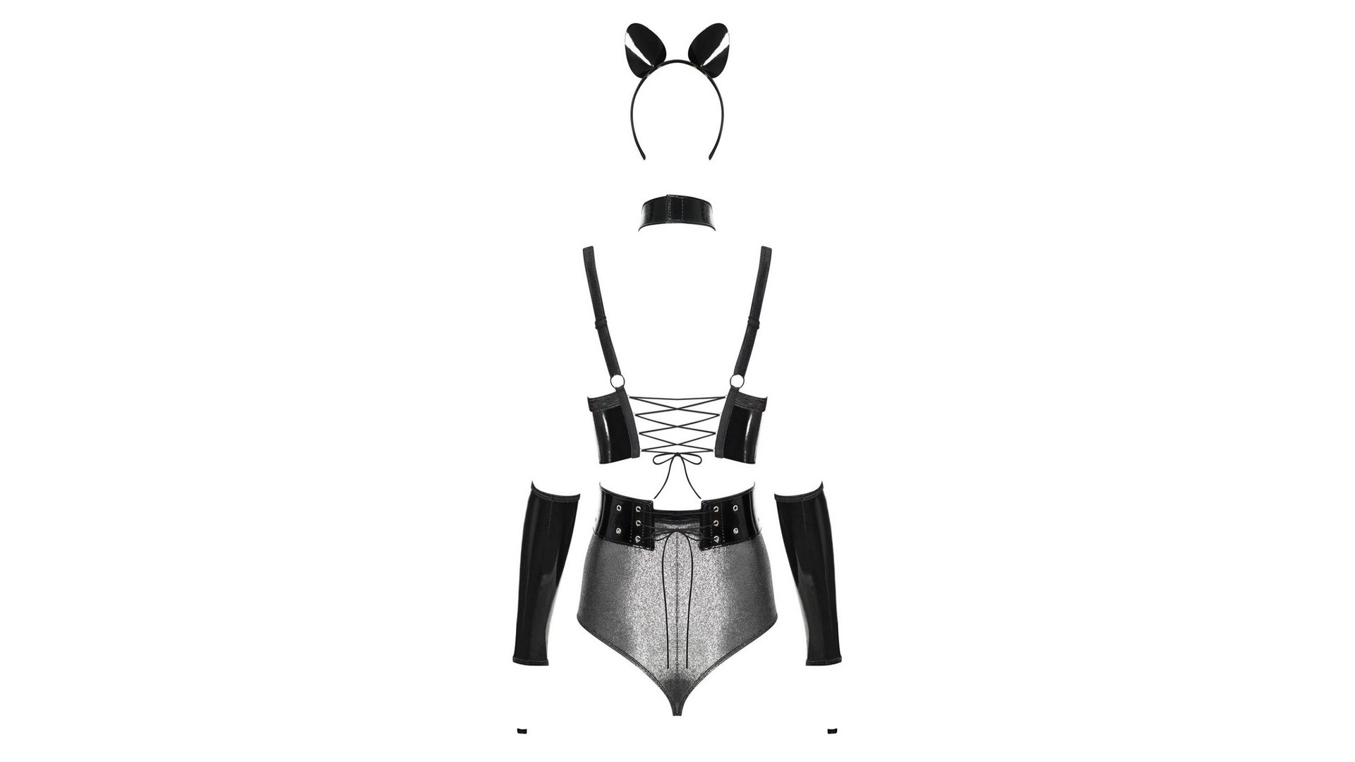 В комплекте: высокие трусики, бюстгальтер, пояс, перчатки, чокер и ушки.