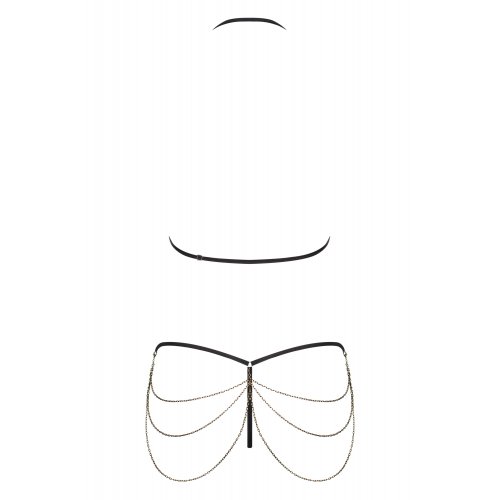В комплект входят бюстгальтер, стринги и декоративные цепочки.