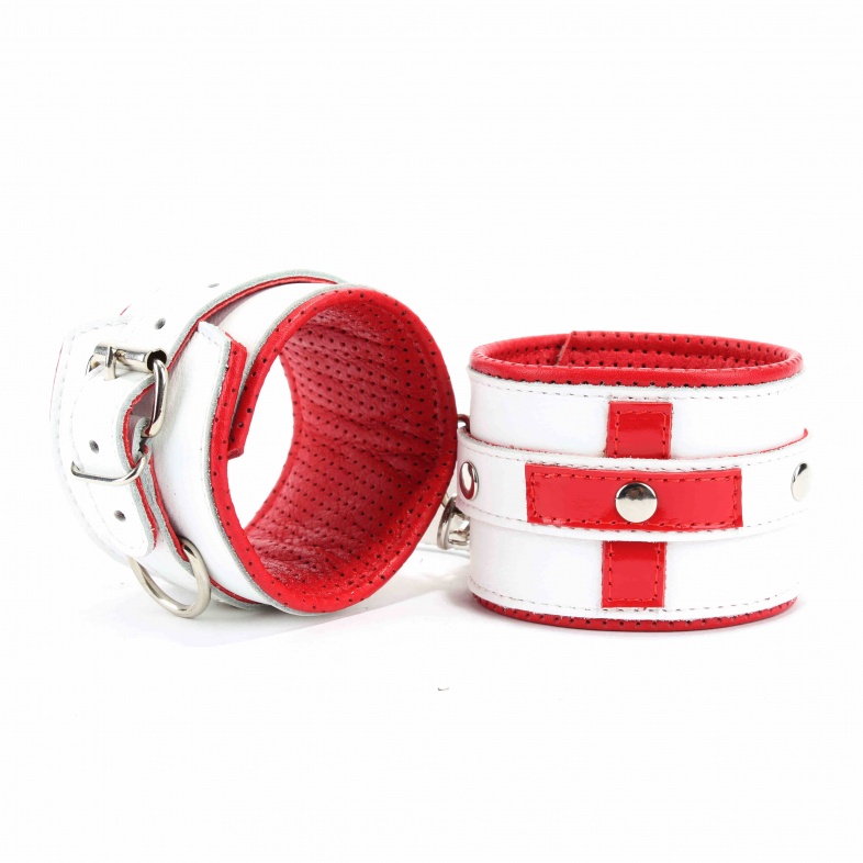 Оковы выполнены из натуральной кожи, декорированы для образа медсестры. Выполнены из белой гладкой кожи с ярко-красным лаковым крестиком, подклад из нежной красной кожи с перфорацией для максимально комфортного использования.Ширина оков 6см, ширина ремешков 2см. Подойдут на обхват от 17 до 28см. Металлическая пряжка надежно удерживает в подчинении, кожаное соединение с карабинами фиксирует оковы вместе, общая длина соединения 12см.