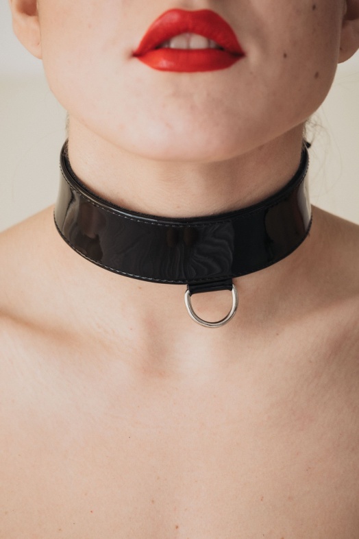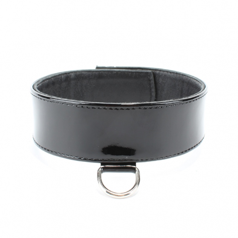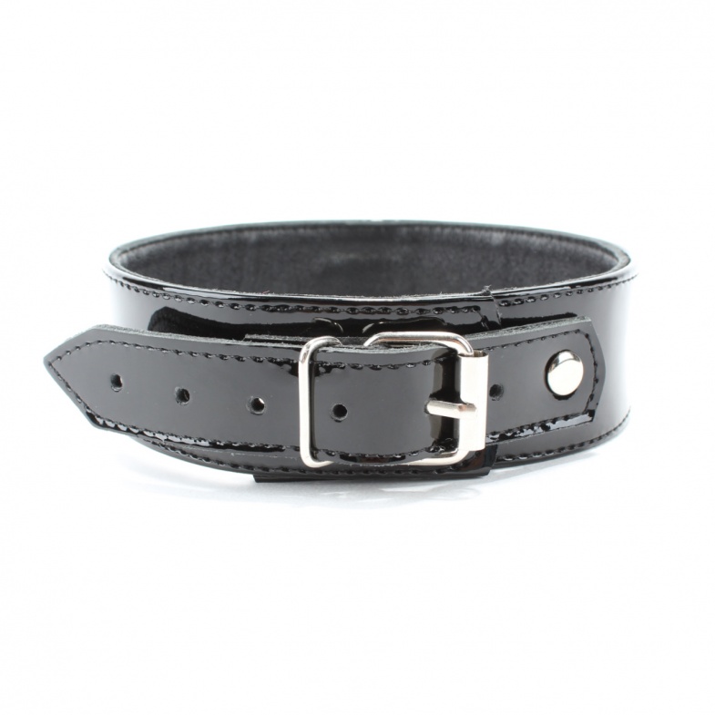 Ошейник выполнен из натуральной лаковой кожи черного цвета.