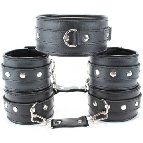 Оковы подойдут на обхват от 15 до 27 см, их ширина 6 см, ширина ремешков 3 см. Наручники подойдут на обхват от 15 до 25 см, их ширина 6 см, ширина ремешков 3 см. Ошейник шириной 5 см, подойдет на обхват от 26 до 40 см.