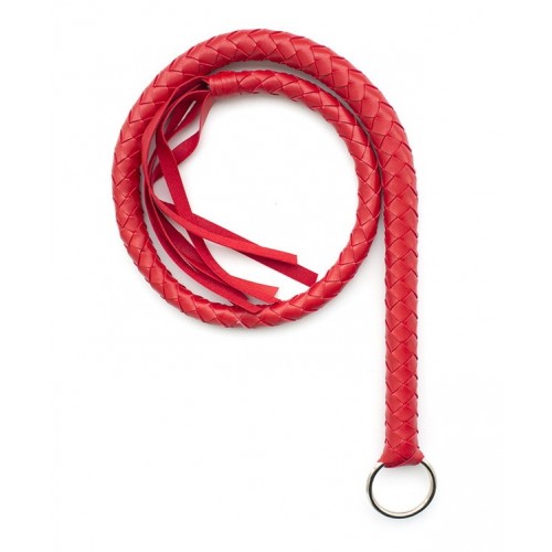 Хлыст выполнен из искусственной кожи красного цвета, с фантастическим плетением, он постепенно утончается к концу, на котором крепятся хлысты, на другой стороне кнута расположено удобное для держания кольцо!