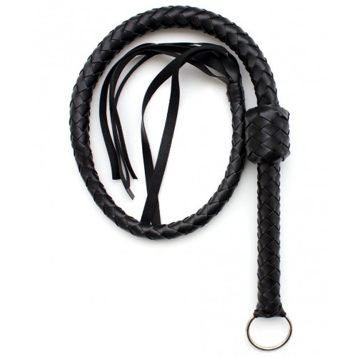 Хлыст выполнен из искусственной кожи черного цвета, с фантастическим плетением, он постепенно утончается к концу, на котором крепятся хлысты, на другой стороне кнута расположено удобное для держания кольцо!