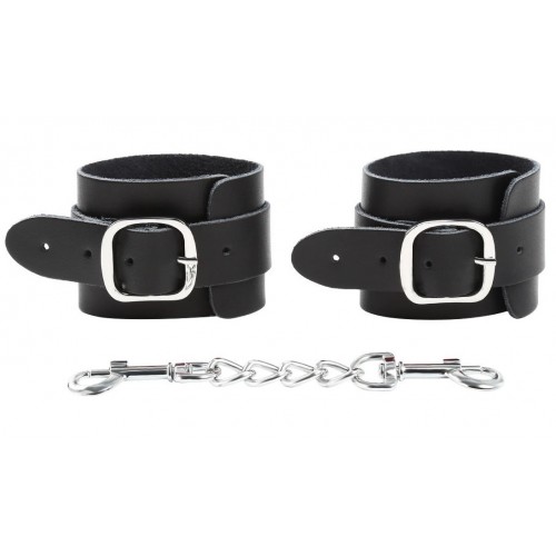 Удобные наручники изготовлены из натуральной кожи. Выполнены в классическом черном цвете, соединены между собой карабином.