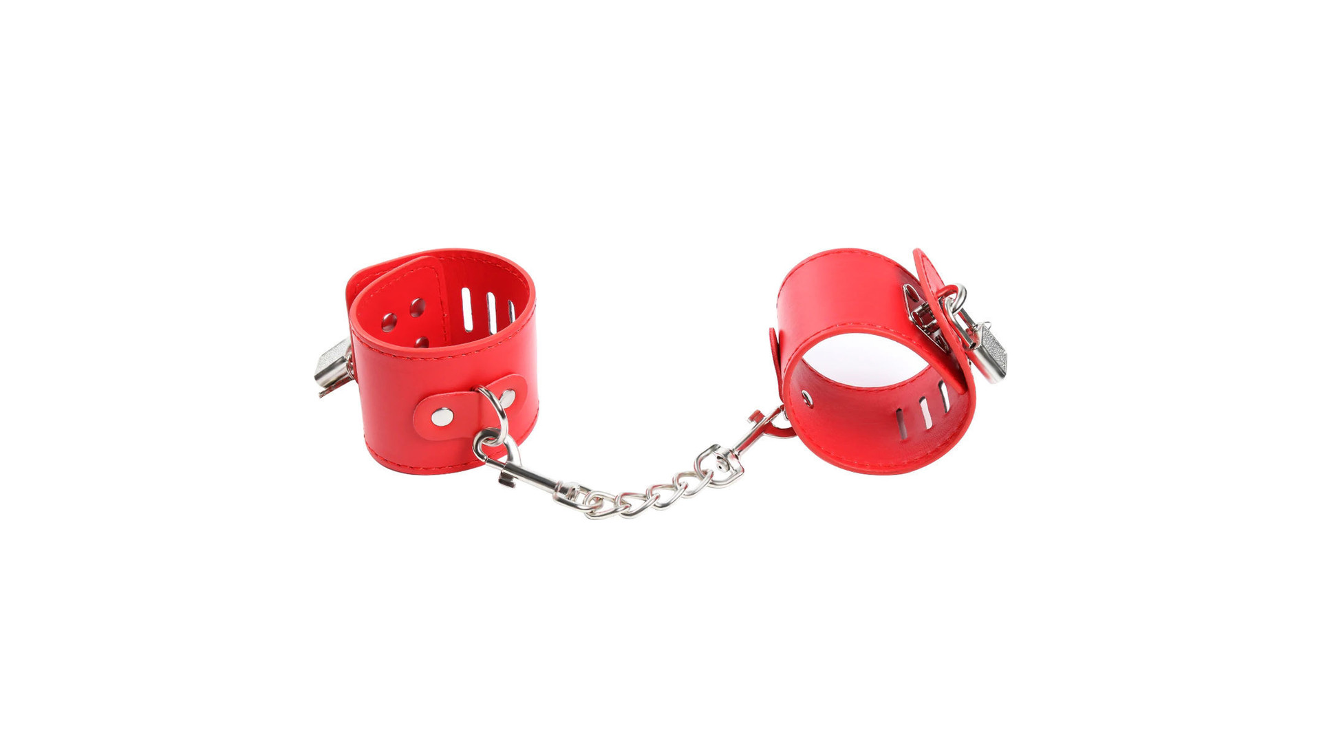 Наручники для БДСМ бондажа из искусственной кожи красного цвета имеют универсальный размер, который удобно регулируется при помощи застёжки на замке.