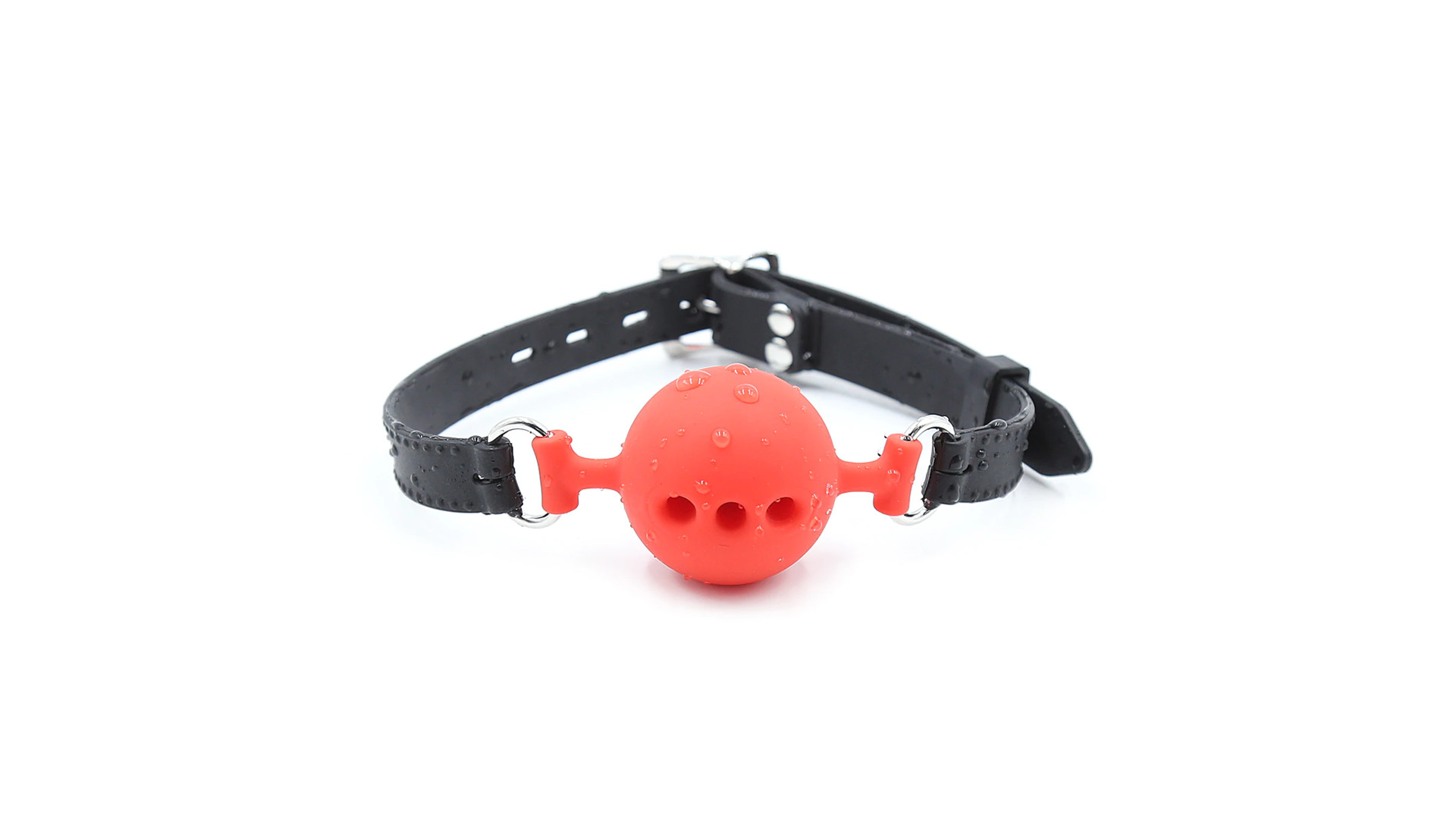 Кляп выполнен в виде силиконового шарика красного цвета с отверстиями.