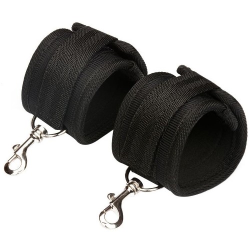 Наручники выполнены из текстиля и отделаны изнутри мягким материалом. Вы не почувствуете никакого дискомфорта во время использования! Так же наручники оснащены карабинами, которые можно соединить с помощью цепочки или же зафиксировать к кровати - решать только Вам!