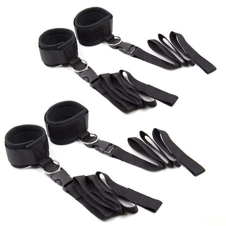 Набор из текстильных ремней, с манжетами для рук и ног, предназначен для фиксации партнёра к кровати. Размеры наручников и поножей являются универсальными и регулируются с помощью липучки.