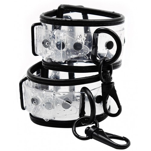 Подчинитесь желаниям своего партнера с помощью этих прозрачных манжет из ПВХ с черной окантовкой, застежкой-пряжкой и металлическими застежками.