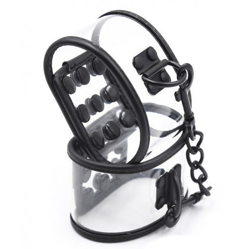 Подчинитесь желаниям своего партнера с помощью этих прозрачных манжет из ПВХ с черной окантовкой, застежками-кнопками и металлическими застежками.