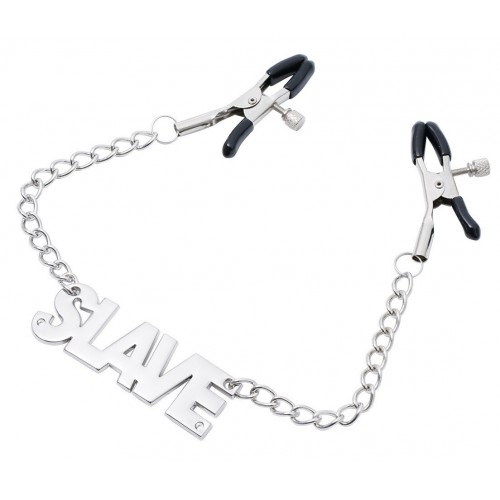 Клипсы на соски, соединенные цепочкой из серебристого металла, украшенные надписью SLAVE, с возможностью регулировать силу зажима.