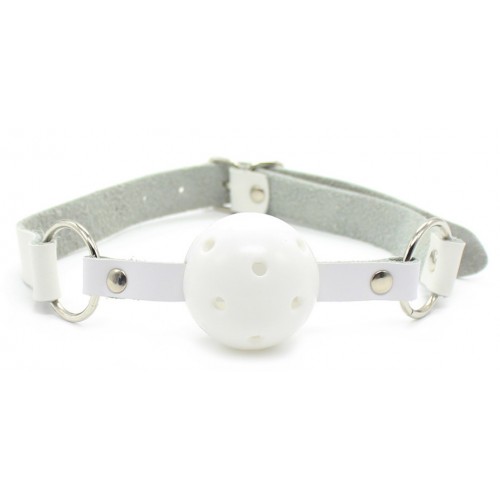 Белый кляп-шар на кожаном ремне