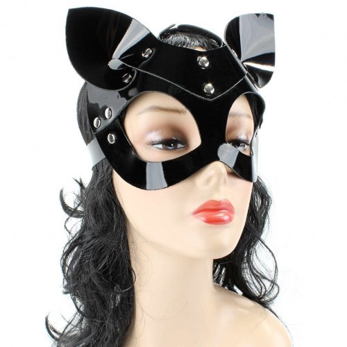 Маска кошки черная, выполненная из лакированной кожи, с металлической фурнитурой, сзади регулируется ремешками. Крупные вырезы для глаз обеспечат прекрасный обзор и комфортное прибывание в образе.