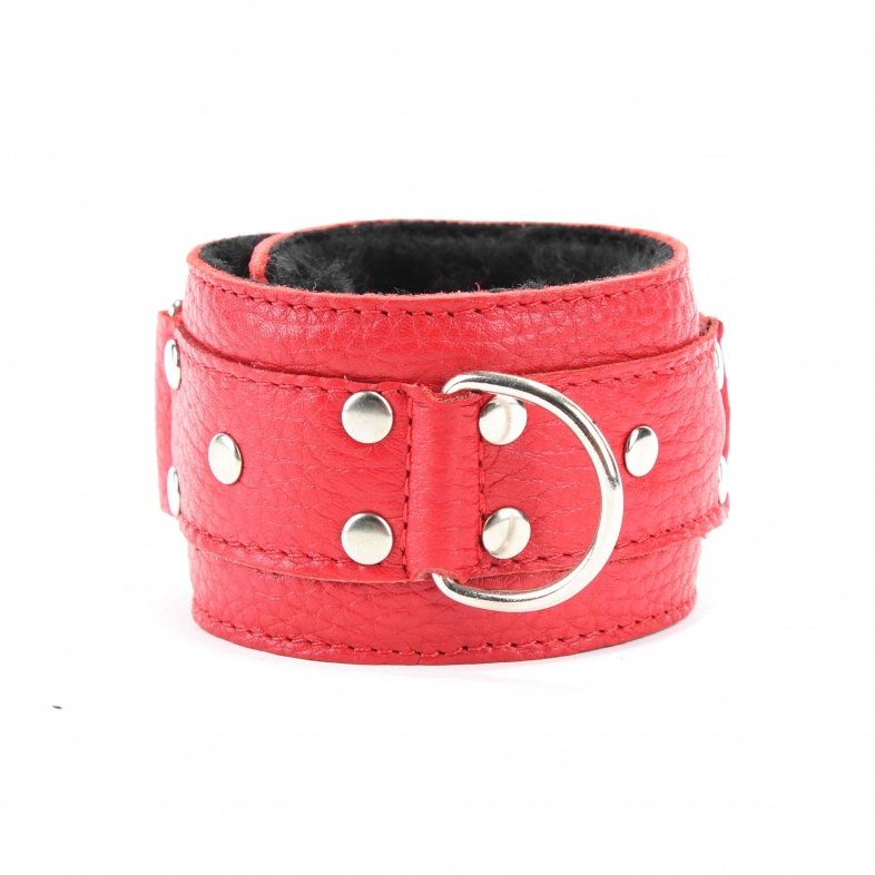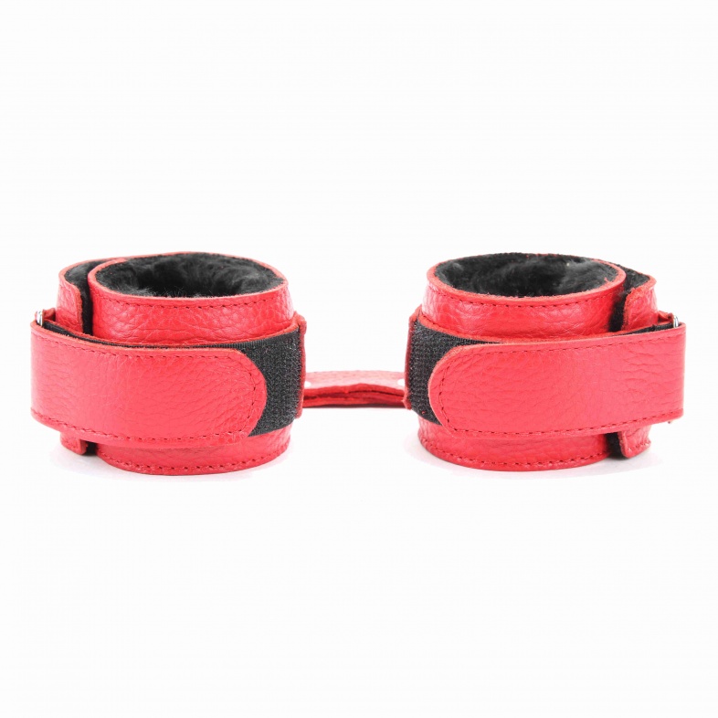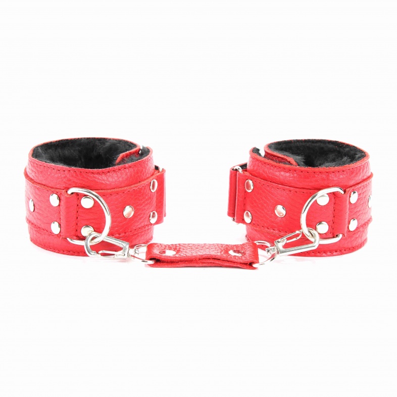 Наручники выполнены из натуральной красной кожи, легко, но надежно фиксируются ремнем на липучке, позволяя выбрать нужный размер. Аксессуар декорирован заклепками. Кожаное соединение на карабинах фиксирует наручники вместе.