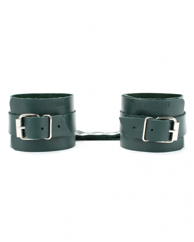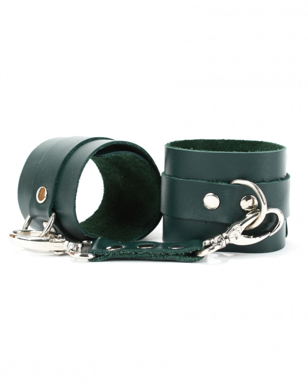 Оковы выполнены из натуральной кожи изумрудного цвета. Металлическая пряжка крепко удерживает в подчинении, кожаное соединение на карабинах фиксирует поножа вместе.