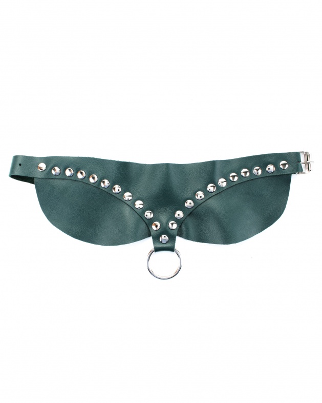 Ошейник выполнен из натуральной кожи изумрудного цвета.Ошейник выполнен из натуральной кожи изумрудного цвета, декорирован заклепками в виде V символа и металлическим кольцом спереди. Сзади аксессуар надежно фиксируется пряжкой, ремень позволяет выбрать нужный размер.