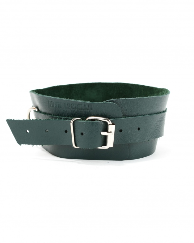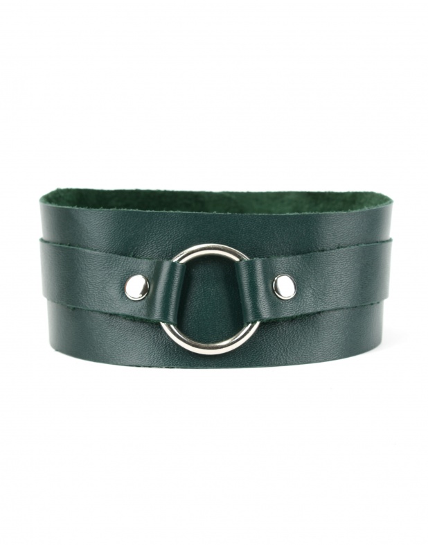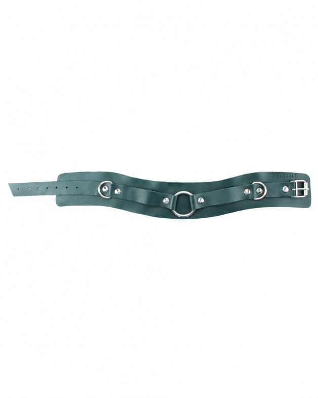 Ошейник сделан из мягкой натуральной кожи изумрудного цвета. Впереди высокая стойка декорирована металлическим кольцом, размер ошейника регулируется пряжкой сзади.