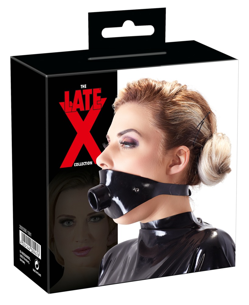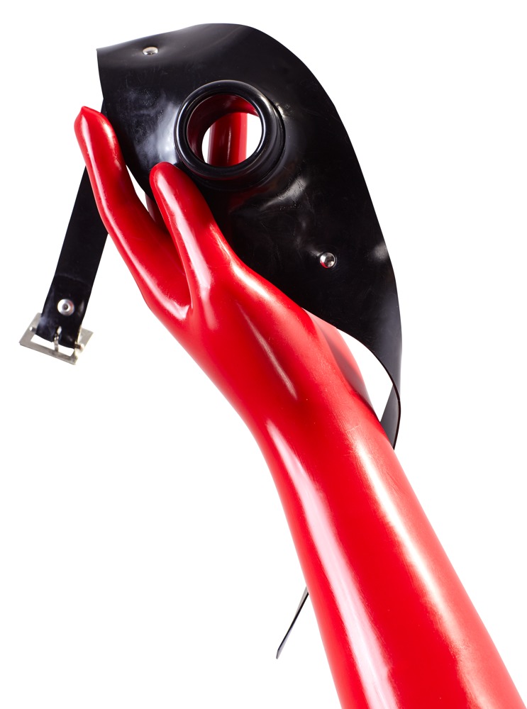 Маска с кляпом черного цвета с коротким фиксированным куском трубки позволяет любой жидкости беспрепятственно попадать в рот.