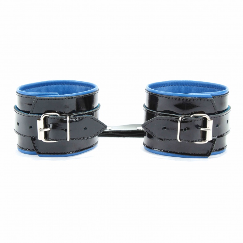 Наручники выполнены из черной натуральной лакированной кожи. Подклад изделия из синей перчаточной кожи. Аксессуар декорирован металлическими заклёпками.