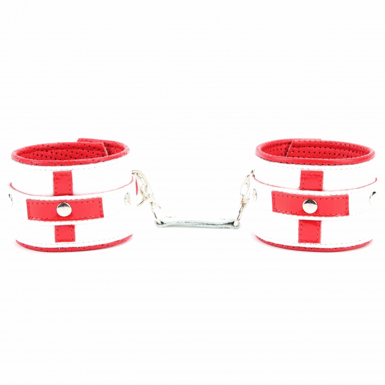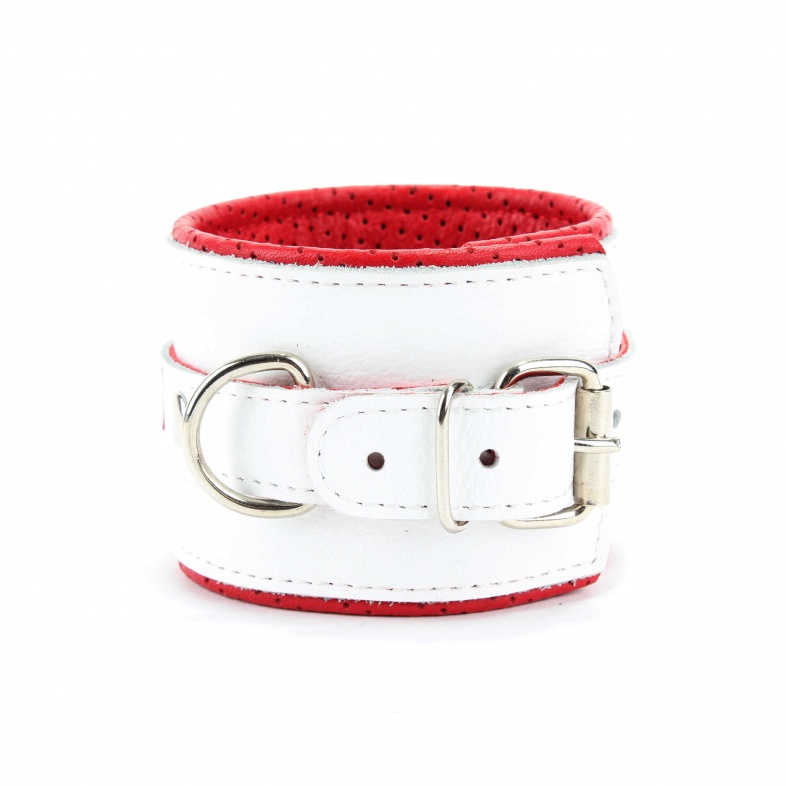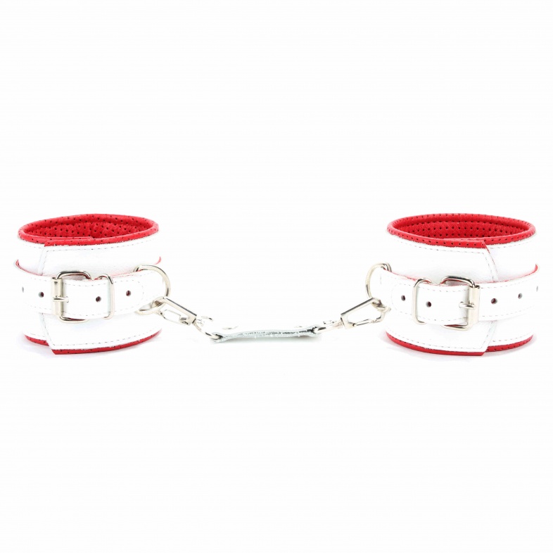 Наручники выполнены из натуральной гладкой кожи белого цвета с ярко-красными лаковыми крестами. Ремни позволяют выбрать нужный размер, металлическая пряжка крепко удерживает в подчинении, кожаное соединение на карабинах фиксирует наручники вместе, подклад из нежной перчаточной кожи с перфорацией обеспечивает комфорт.
