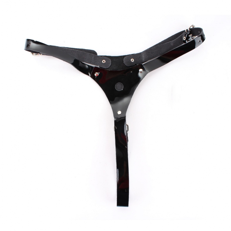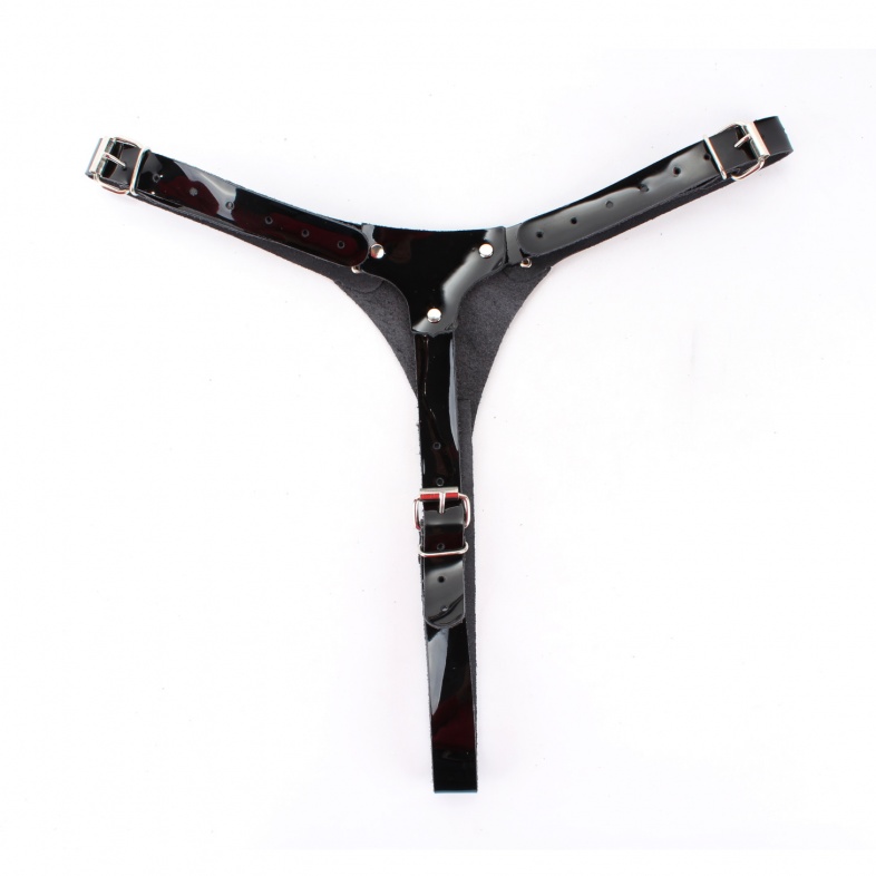 Трусики выполнены из натуральной лакированной кожи черного цвета.Спереди крепится штырек Харнес для насадок (входит в комплект). Изделие фиксируется ремнями и пряжками, позволяющими подобрать нужный размер (S-L).Ширина ремешков 2см.