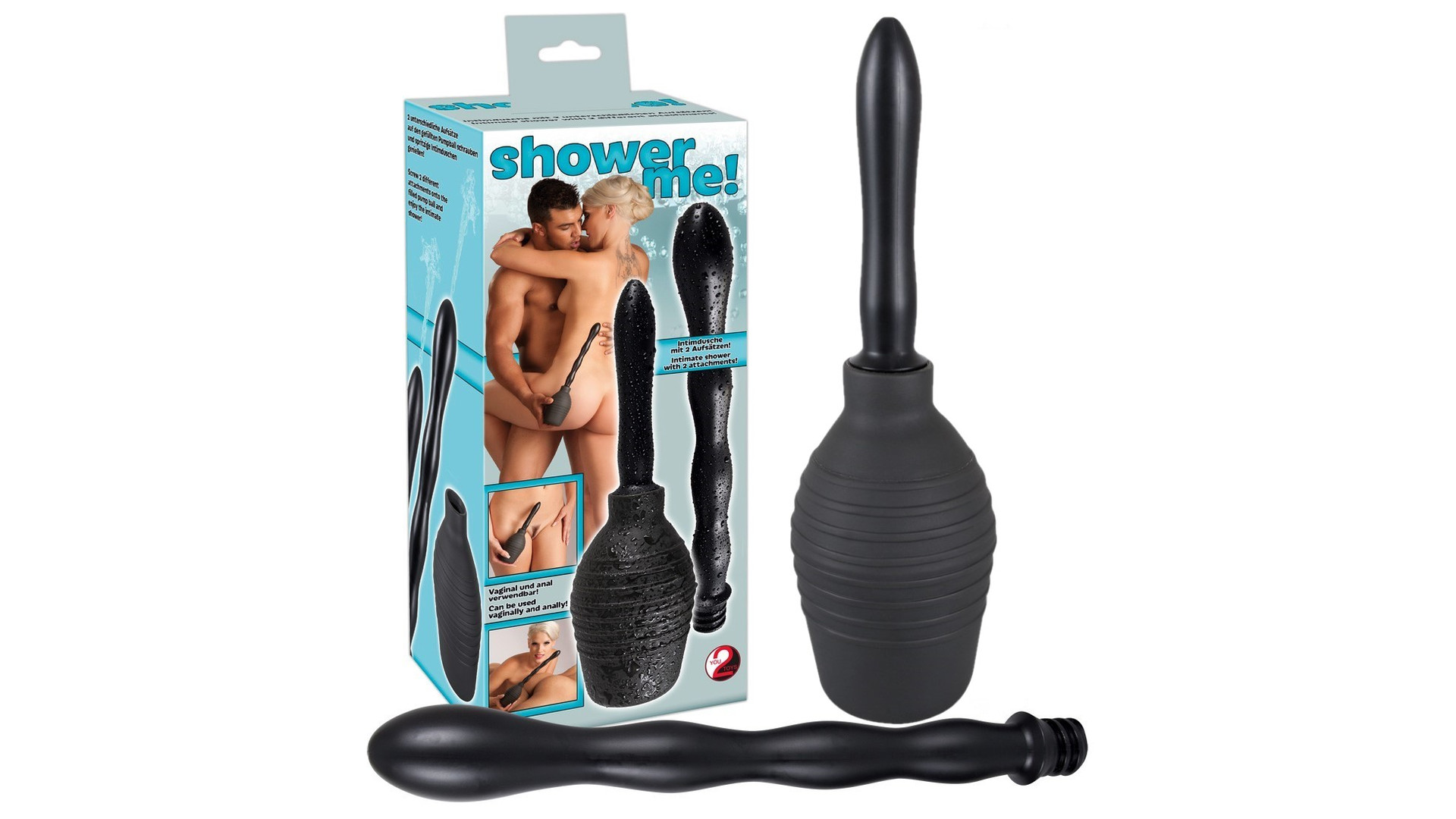 Черный интимный душ с двумя сменными винтовыми насадками легко моется, имеет приятный плотный материал и идеально подходит как для анального введения, так и для вагинального.