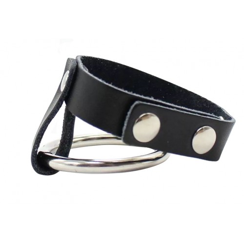 Кожаный ремешок крепится под мошонкой или у основания члена, железное кольцо располагается на самом пенисе.