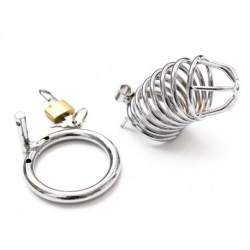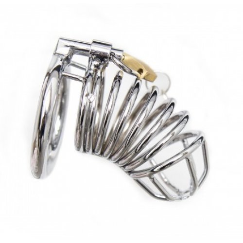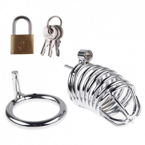 Комплектация: клетка для пениса, запорное кольцо, замок с тремя ключами, бархатный мешочек для хранения.