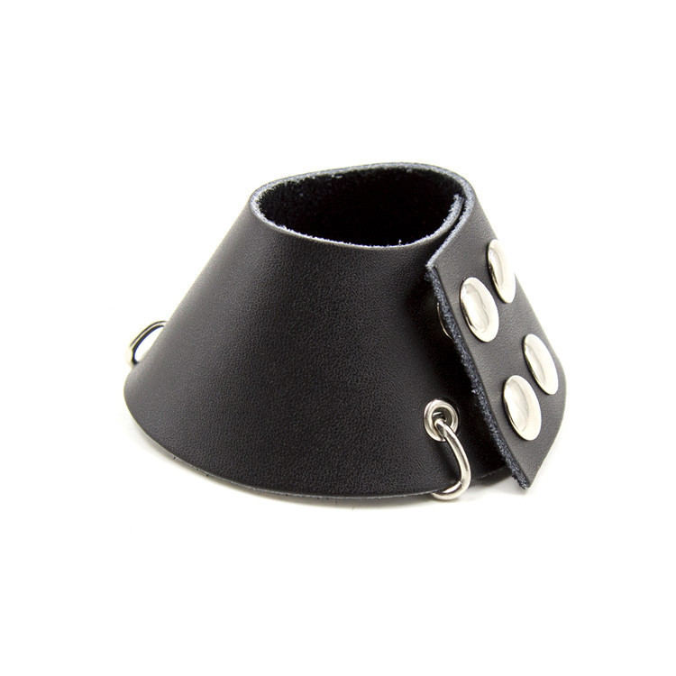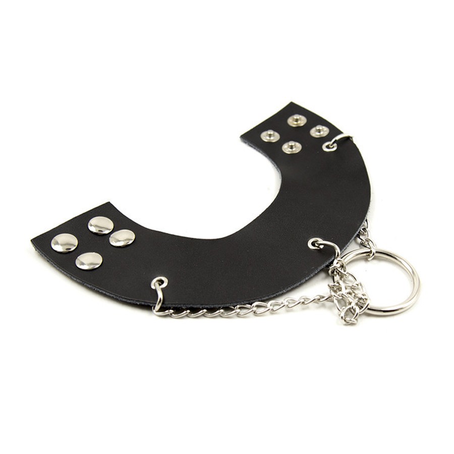 Утяжка для мошонки черного цвета на клепках с металлическими цепочками отсрочит приближение кульминации и сделает оргазм ярче.