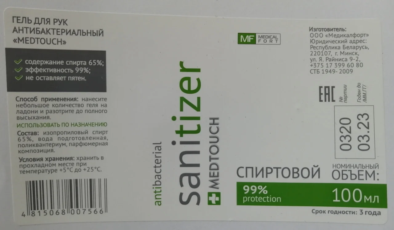 Гель для рук антибактериальный спиртовой Sanitizer Medtouch.