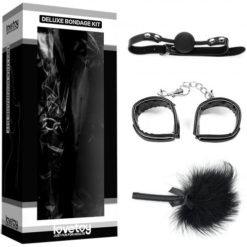 Подарочный набор для ролевых игр Deluxe Bondage Kit включает в себя всё необходимое для создания более пикантных моментов в отношениях влюблённых пар: де-люкс силиконовый кляп-шар на кожанных ремешках с металлической застёжкой,перьевой тиклер длиной 15 см., наручники из искусственной кожи с мягкой вкладкой.
