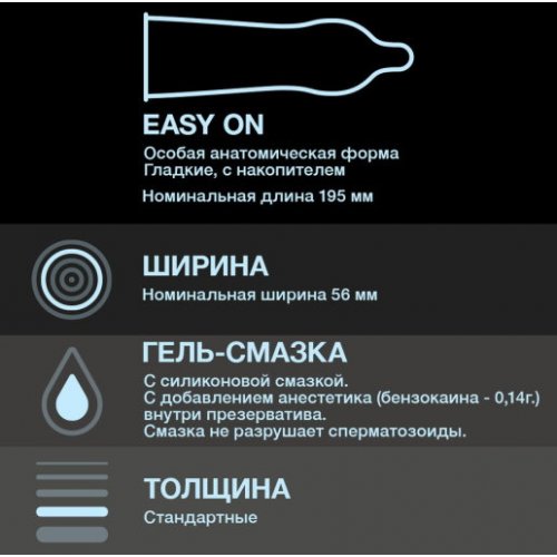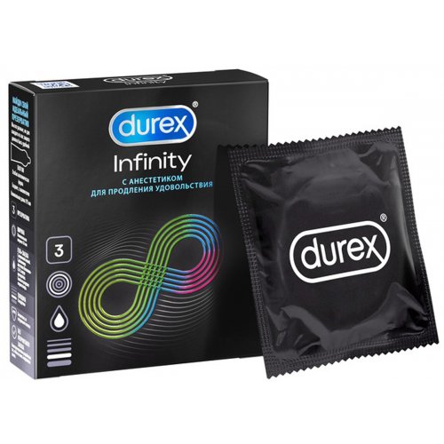 Презервативы Durex Infinity содержат смазку с добавлением анестетика (бензокаина) внутри презерватива и обычную силиконовую смазку снаружи. Для продления полового акта, а также предотвращения преждевременной эякуляции. Благодаря технологии производства не имеют неприятного запаха. Все предусмотрено для того, чтобы вы могли расслабиться и наслаждаться безопасным сексом.