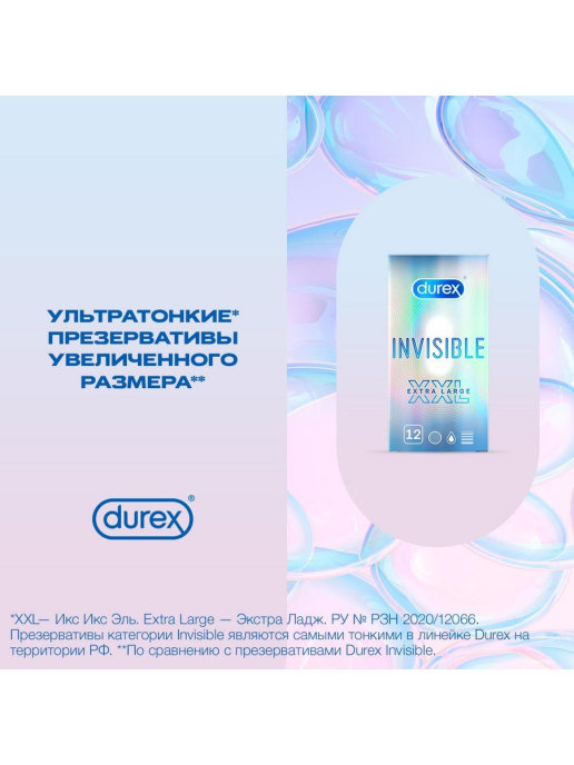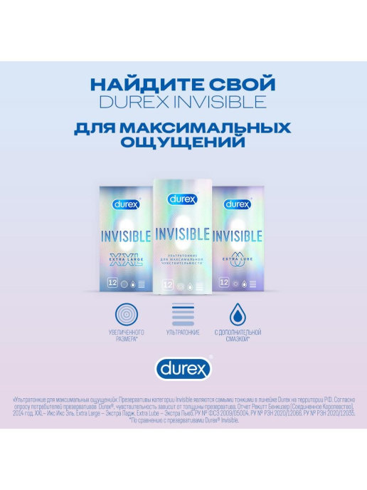 Durex Invisible XXL подойдут тем, кто ищет ультратонкие презервативы большего размера, чем Durex Invisible. Теперь вы сможете испытывать максимальные ощущения, наслаждаясь комфортом и безопасным сексом!
