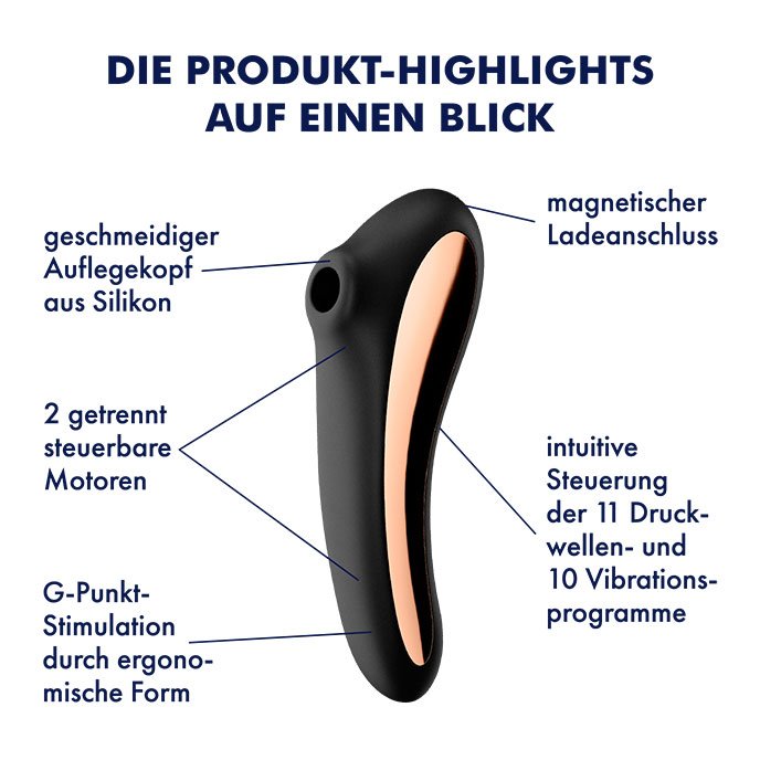 В дополнение к стимуляции клитора с использованием проверенной технологии волны давления, таланты Satisfyer Dual Kiss включают развратный массаж G-spot - благодаря вибрации в изогнутом, вставляемом хвостовике!
