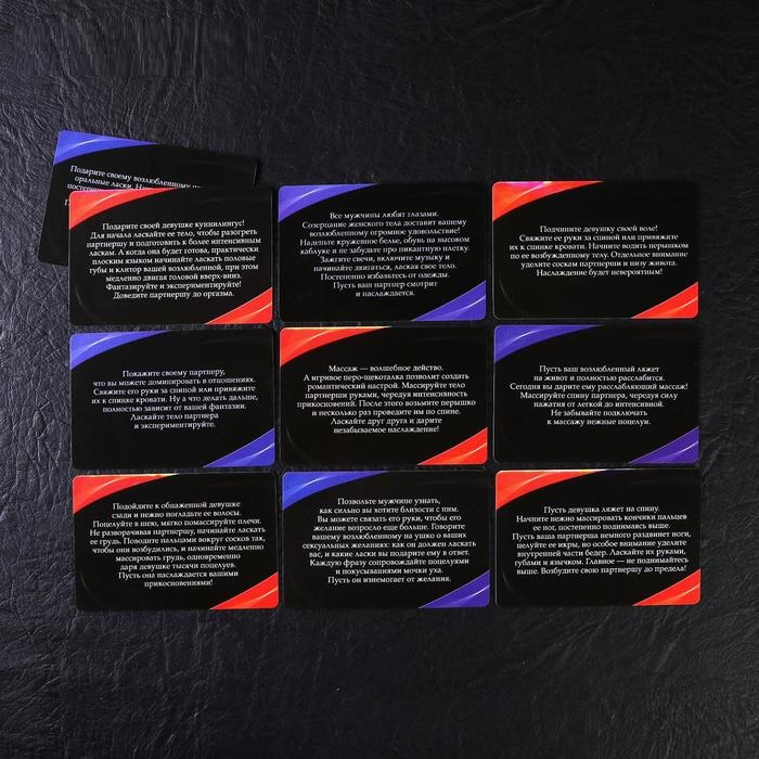 Внутри вас ждут 10 карточек фантами — для него и для неё. По очереди вытягивайте карточки и выполняйте то, что на них написано. Используйте верёвку, чтобы сделать игру более пикантной.